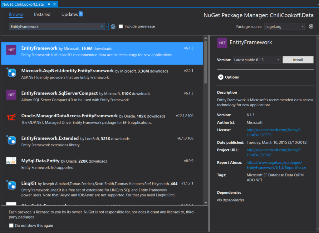 - Click on EntityFramework in the selection results, then the Install button in the right side frame. The latest stable version will be preselected for you.