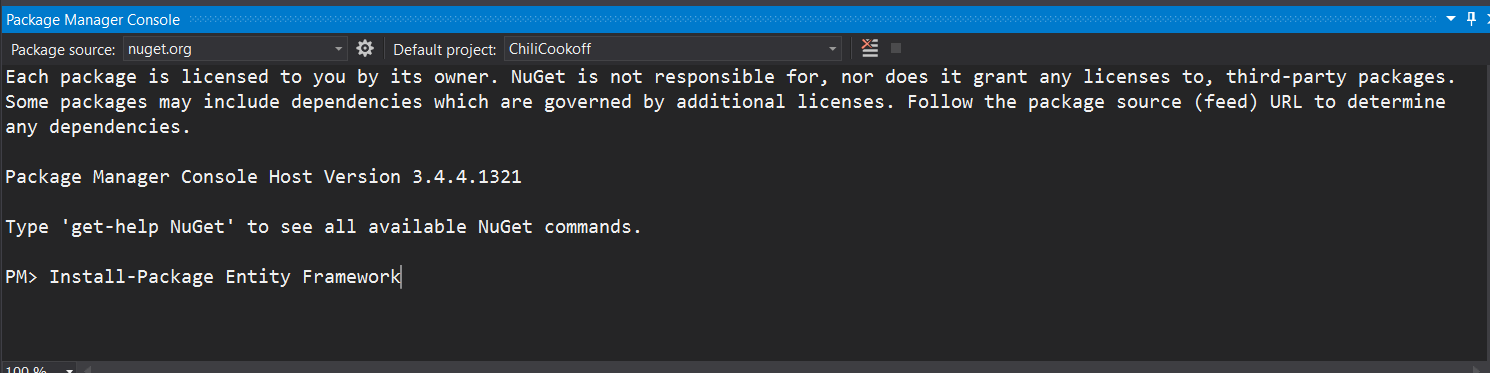 - In the Package Manager Console window type: Install-Package EntityFramework