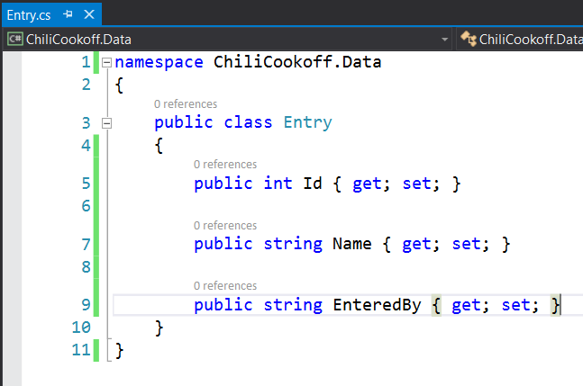For the purposes of this article, we will be creating a sample MVC 5 application that allows users to vote in a chili cook off. We’ll start off by creating an entity for the chili entries. In the ChiliCookoff.Data project, create a new class called “Entry.cs” and enter the code below.