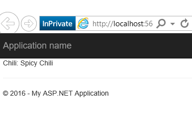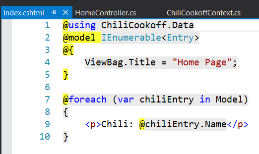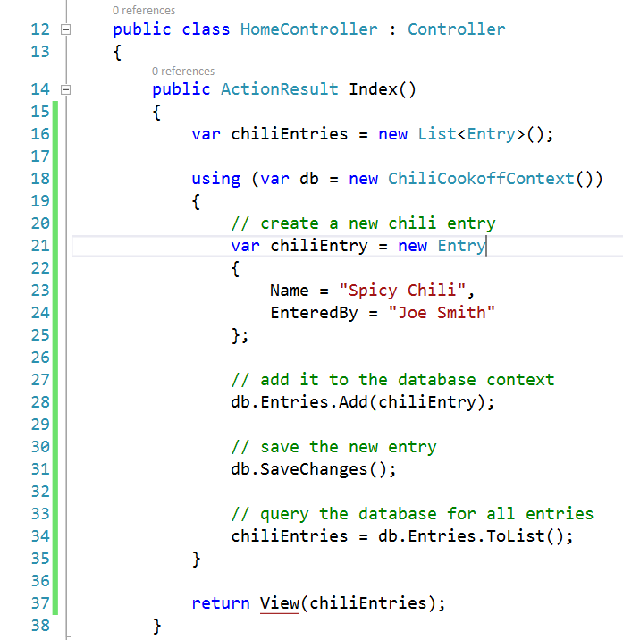 With the entities and database context created, we can now write code to add data to the database and retrieve data from the database. In this very simple example show below, we’re writing code in the HomeController Index ActionResult to add a new chili entry then retrieve all chili entries from the database. Then we’ll pass the list of chili entries to the home page for display.