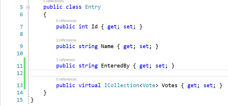 Code First can be used to create relationships in the database between tables including one to one, one to many, and many to many. We’ll change our entities to reflect a more real world example where a vote could be cast for a chili entry multiple times. To represent this in our model, we’ll add a navigation property to the Entry entity which will hold the Vote entities related to the Entry. We’ll also remove the VotedForId property from the Vote entity since that will no longer be needed. Note that the navigation property is defined using a virtual which will allow it to take advantage of lazy loading.