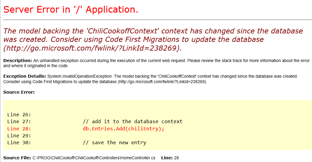 This error is occurring because we have made a change to the model but we have not updated the database schema. In order to update the database schema, we’ll need to use Code First Migrations which allows us to specify exactly what changes to make to the schema.