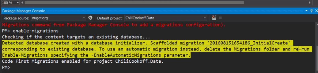 To use migrations, we need to enabled them by using the NuGet Package Manager console window.