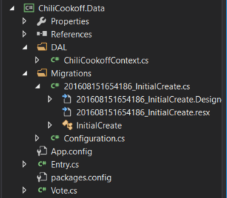 You’ll also notice a new folder called “Migrations” and a couple new files were created in your project. The Configuration.cs file contains the settings that the migration uses for modifying the database model. The other file that ends with “_InitialCreate” represents your current database model and is your first migration.