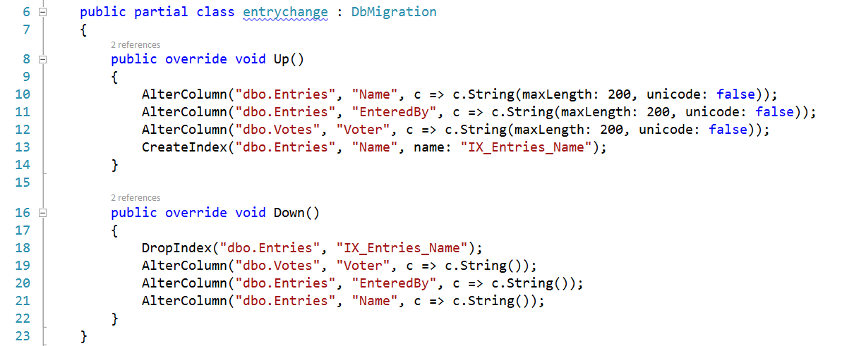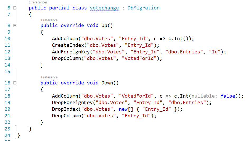 With migrations enabled, we can now scaffold the change we made to the Votes entity by typing in “add-migration votechange” in the NuGet Package Manger console window. Once the scaffolding is complete, you should see a new migration file that was created with the changes to Entries and Votes tables. Note the migration file has an Up and a Down method. This is used by migrations to make changes to the database (the Up method) and can also be used to revert those changes (the Down method).