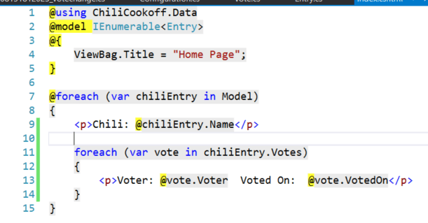 Next, we will change the Home Index.cshtml page to display the voter for the chili entry.