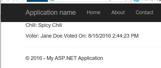 Now we’ll change the code in the HomeController to save a vote for our chili entry then display the vote. Replace the existing code in the HomeController with the code below.