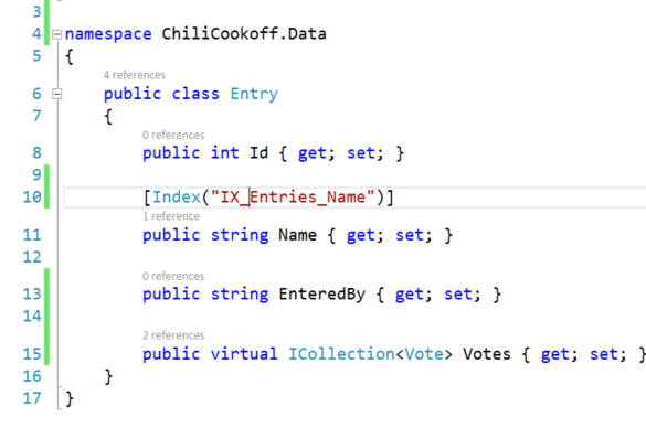 Let’s say we plan on having a search page of our chili entries that allows search by the name of the entry. That will present a performance problem if we have a large number of entries because the Name column in the Entries Table is not indexed (not to mention the Name column was defined as NVARCHAR(MAX) in SQL Server which we fixed using the Fluent API). To resolve this issue, we can use the “Index” Data Annotation as show below.