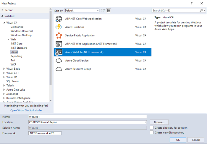 Visual Studio 2017 provides support for creating WebJobs as long as you have the latest Azure SDK installed. In Visual Studio, go to File, New Project and select the Cloud option under Visual C# and you’ll see the Azure options available.