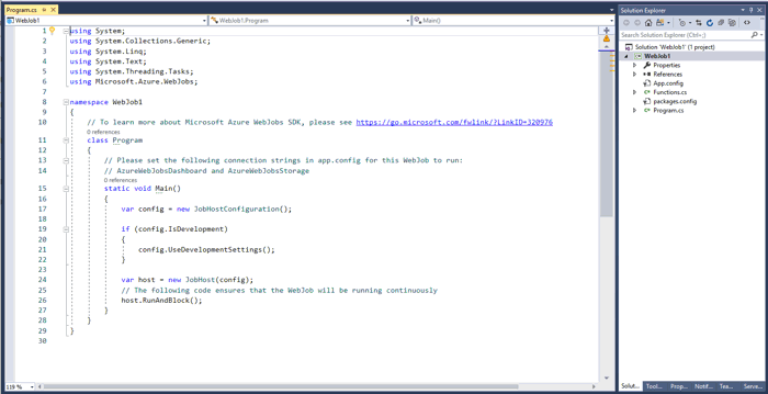 Once you create the project, you’ll get scaffolding for a WebJob as shown below.