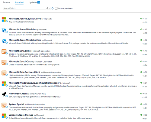 Take a look at the NuGet packages by right-clicking on the project and selecting Manage NuGet Packages…, and you’ll see that Microsoft.Azure.WebJobs and Microsoft.Azure.WebJobs.Core have been added for you automatically.