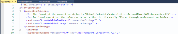 Once you have the NuGet packages installed, there are 2 connection strings you’ll need to enter in order for the WebJob to function correctly. There is a comment about this above Main in Program.cs in case you forget. In your App.config file you’ll see entries for AzureWebJobsDashboard and AzureWebJobsStorage. Fill those out as described in the comment above the entries.
