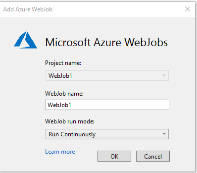 Publishing the WebJob to Azure could not be easier. Just right-click on the project and select Publish as Azure WebJob. You’ll be prompted to name the WebJob and choose the run mode. For this task, I needed the WebJob to run continuously so that the timer trigger can function correctly.