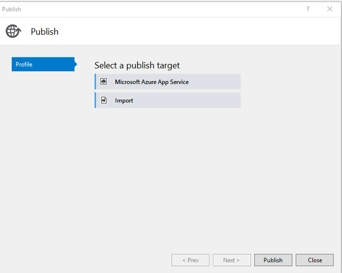 Next, you’ll be prompted to select a publish target. Click on the Microsoft Azure App Service to select your Azure Subscription and select an existing app service or create a new one.
