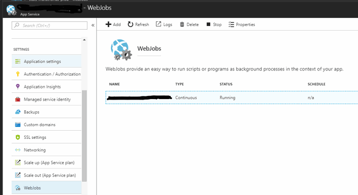 With the WebJob published, go into the Azure Portal and select your App Service. Under Settings, select WebJobs to see the WebJogs page. From this page, you can start and stop your WebJob and view its properties. There is not much else you can do here but click on the Logs button which will take you to the WebJobs page for monitoring.