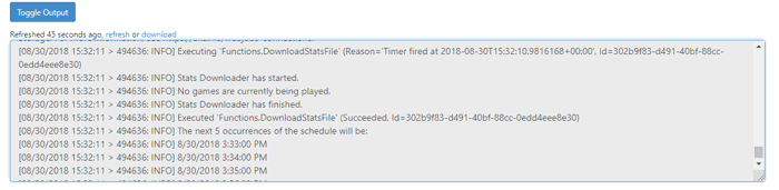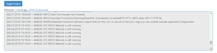 From here, you can click on the Toggle Output button and view the live stream of your WebJob log entries.