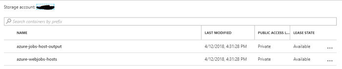 While the live stream is helpful in troubleshooting issues when you initially deploy the WebJob, it is not helpful for problems that come up after the WebJob has run for some time. Remember the 2 connection strings we set earlier? AzureWebJobsDashboard and AzureWebJobsStorage define where the WebJob stores log files. AzureWebJobsDashboard is primarily used by Azure WebJob SDK to store logs from the WebJobs Dashboard. AzureWebJobsStorage should point to a storage account where the logs are stored. The WebJob runtime creates 2 containers in this storage account with the names "azure-jobs-host-output" and "azure-webjobs-host" in the Blob service. You can view the containers by going to your Storage account and selecting Blobs under services.