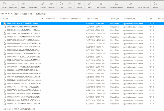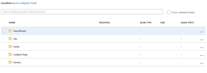 The azure-jobs-host-output container has the logs created by the WebJob runtime during initialization and termination of every execution. The azure-webjobs-hosts logs into several folders. Heartbeats contains logs for the heartbeat service, ids contains a log for the unique identifier for the service, and output-logs has the output of the explicit log for each time the service is run. The output-logs folder is where you will find the log output from your WebJob.