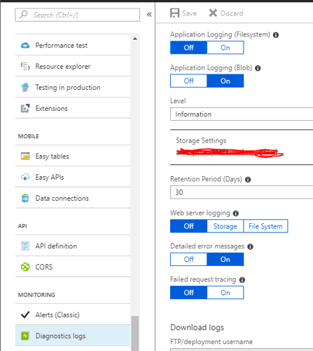 One of the issues I have with this setup is there is no easy way to get to a log file for a particular date and time when I need to troubleshoot the WebJob. One way to implement logging so that I can find a log file for a date and time is by enabling web application logging. Go to the App Service, select Diagnostics Log, then click on On under Application Logging (Blob). You’ll be prompted to select a Storage Container and the Retention Period.