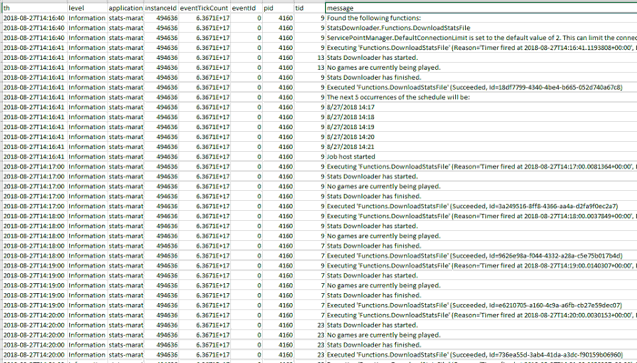 The log files that get created for the Application logging are in CSV format. Better than that, they are created in a folder structure of <year>/<month>/<day>/<hour> so you can find a log file for the exact date and time you want to view.