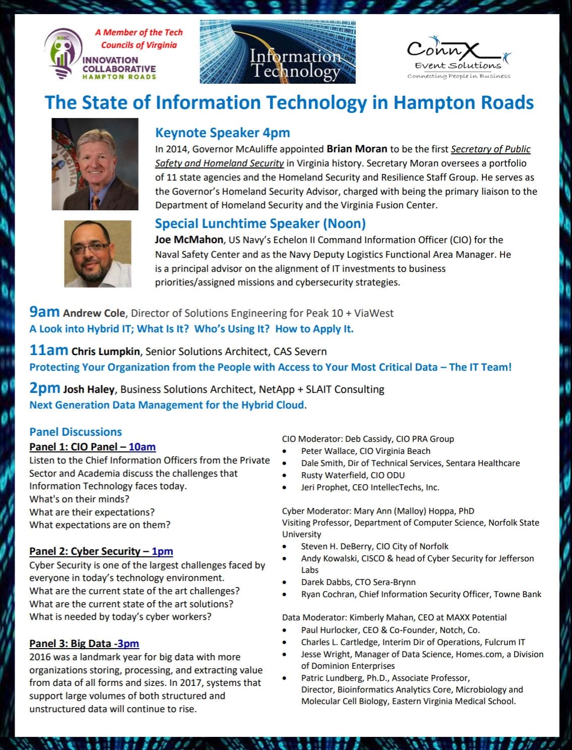 Cyber Security was a primary focus for many vendors and attendees at the conference. To satisfy that demand, a panel moderated by Professor Mary Ann Hoppa from Norfolk State University addressed many of the opportunities and challenges that come with Cyber Security. Ryan Cochran, the CISO of TowneBank, expressed one of the biggest challenges in Cyber Security is making sure they are investing enough and investing in the correct area. One comment that got the crowd going was made by Darek Dabbs, CTO of Sera-Brynn, where he stated that the elimination of BitCoin could easily take away 50% of the recent ransomware attacks. A point made by Andy Kowalski, CISCO at Jefferson Labs, was that the security compliance requirements caused more issues trying to conform to requirements that were not written with their systems in mind, and rather use that time to keep developing their own internal security wish list. Finally, Steven DeBerry, CIO of the City of Norfolk, made several points that it is the internal cultural challenge with all users to think of security threats in all their use of technology.