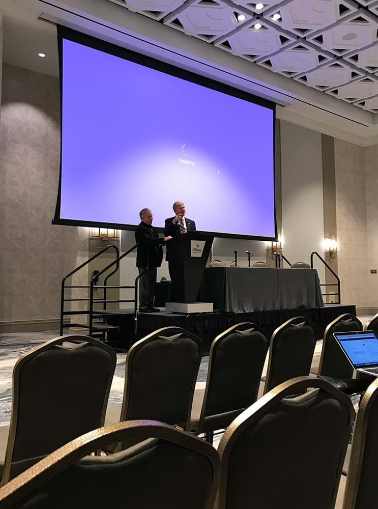 The final speaker of the day was Virginia Secretary of Public Safety and Homeland Security, Brian Moran. He updated the group on developments and ongoing threats to the commonwealth. He highlighted recent developments Virginia has made in the area of drones, taking a leadership role in that developing industry. Secretary Moran related the day-to-day technology challenges he faces to the group, and used the events of 8/17 in Charlottesville as an example of how they used multiple implementations of technology to assist with the events of that weekend. He highlighted the opportunities that Virginia businesses can take advantage of to help foster technology. Moran also made a point to say that Virginia wants to be the destination for companies to invest in leading edge technologies. One of the most challenging areas of his office is defining guidelines for security for devices like body/license plate cameras used by local police. He thought that keeping those areas open without strict regulation, even some of those areas know are regulated by the city. As a final note, Secretary Moran taught us the important lesson of never allowing Windows Updates during a presentation - as you can see in the photo. However, he knew his material and was able to give a great presentation without the assistance of slides.