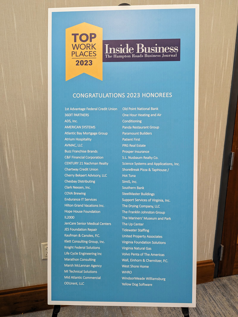 The Top Workplaces in Hampton Roads awards are presented annually by Inside Business and their partners at Energage, an employee survey company based in suburban Philadelphia.